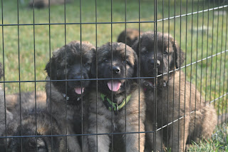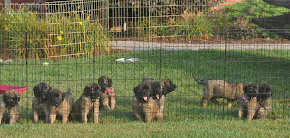 Plotting Puppies Posted on August 5, 2010 by cindy Do not let those angelic faces fool you – the puppies are ALWAYS plotting their escape from the pens!!! The puppies are all wearing their new collars and are having great fun in their pool and roaring around the backyard.